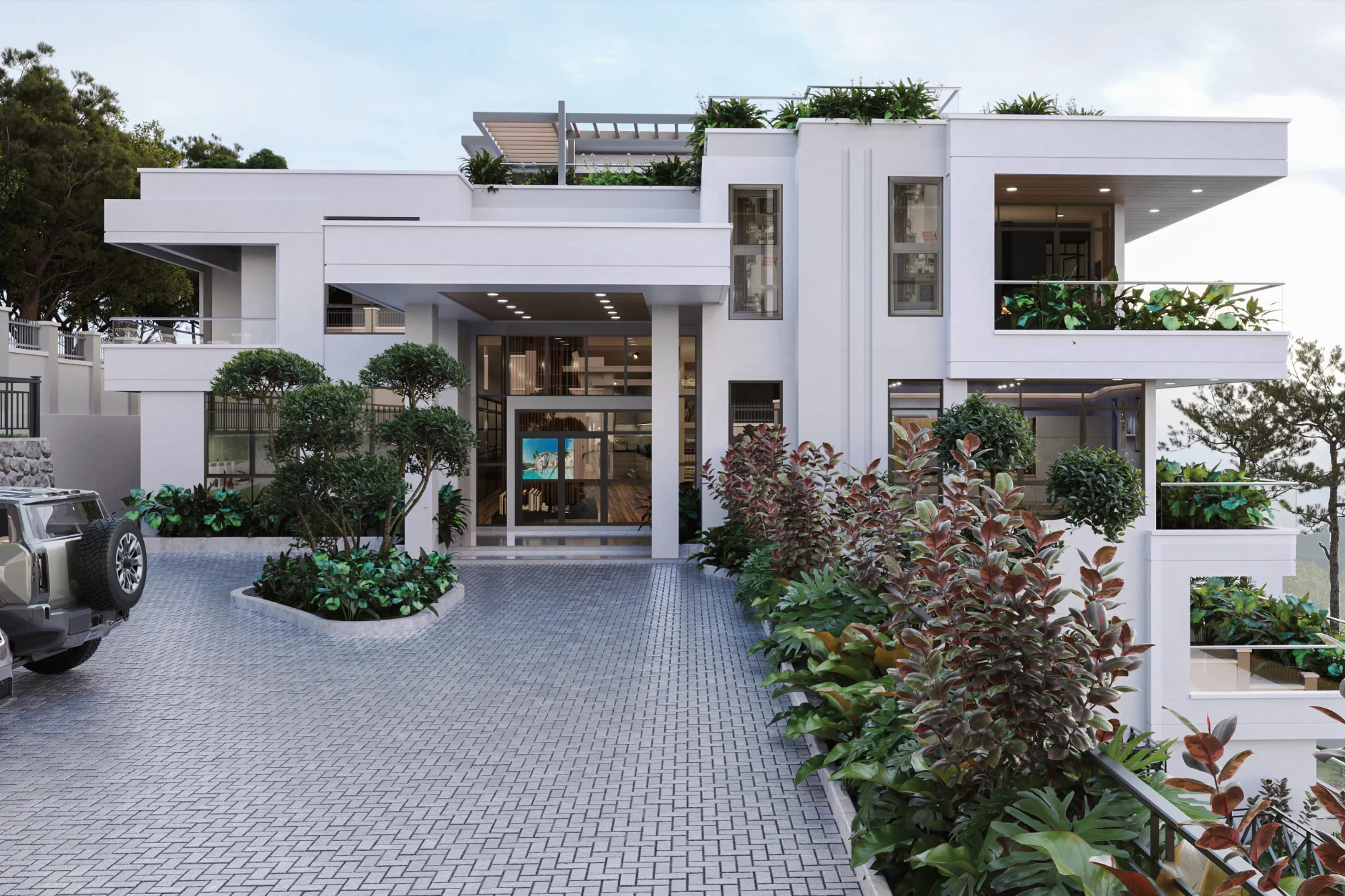 The architectural vision for the Ziranumbu Residence was to create a vertical sanctuary where light, air, and form define the experience of home. Rising four levels, the structure maximizes the compact footprint of its site while ensuring every floor enjoys a sense of openness. The design embraces clean contemporary lines, softened by natural materials and landscaping that anchor the building to its environment. Sustainability and efficiency are woven into the concept, from passive cooling strategies to carefully planned circulation.